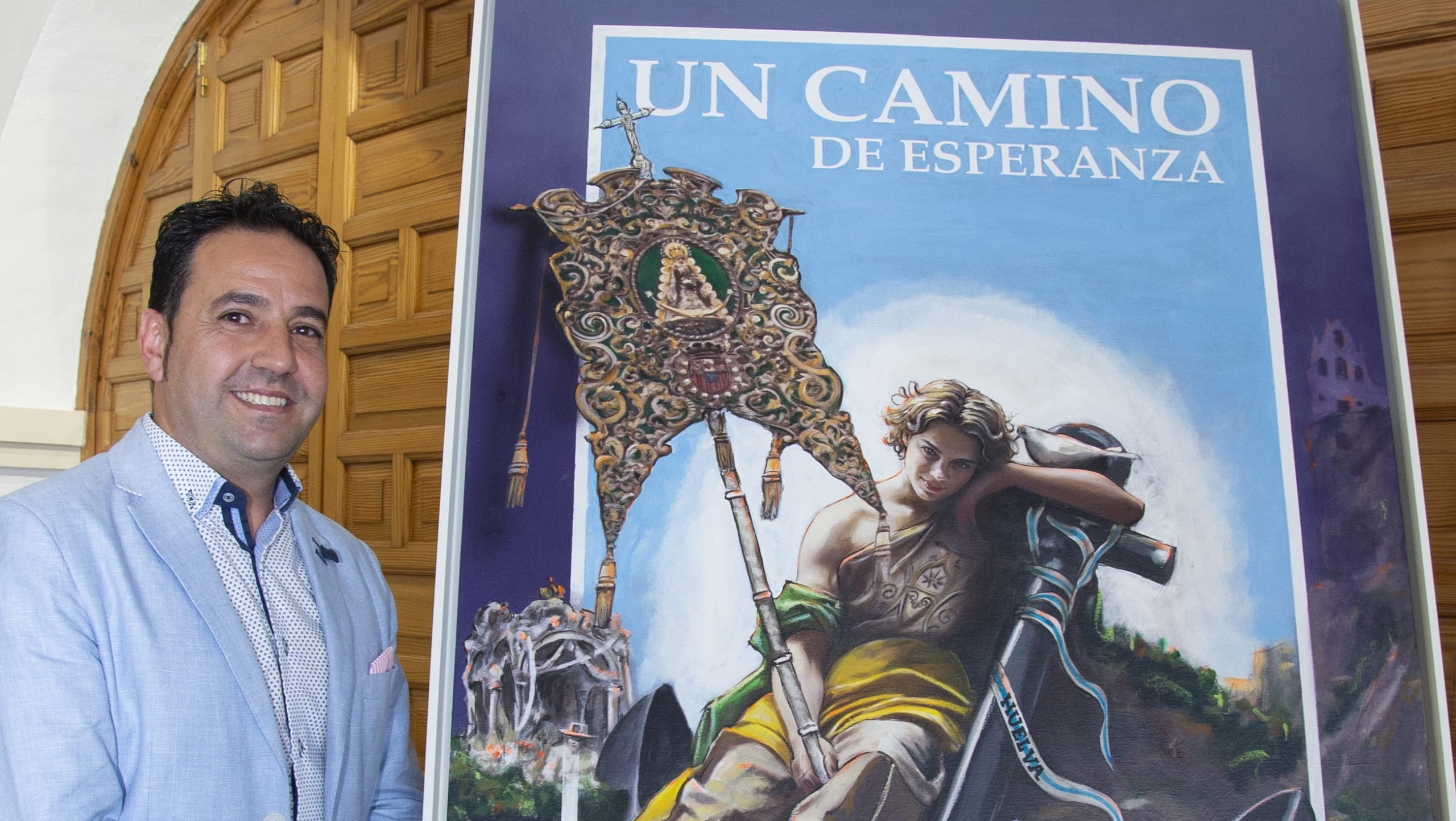 Una vez presentado el programa de actos, se procedió al descubrimiento de la magnífica obra que N. H. Chema Riquelme ha realizado para ilustrar el cartel anunciador del evento. Una pieza que recoge un fuerte contenido simbólico en el aspecto litúrgico y religioso, así como de onubensismo, en la que la referencia principal es la Iglesia, representada por una figura femenina envuelta en la Bandera Asuncionista y que porta el Simpecado de la Hermandad.
